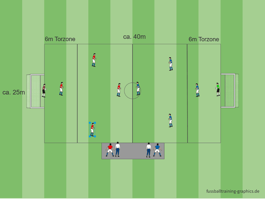 - Eine Rotation der Spieler erfolgt ca. alle 3 Minuten (Eigenverantwortung der Trainer!)